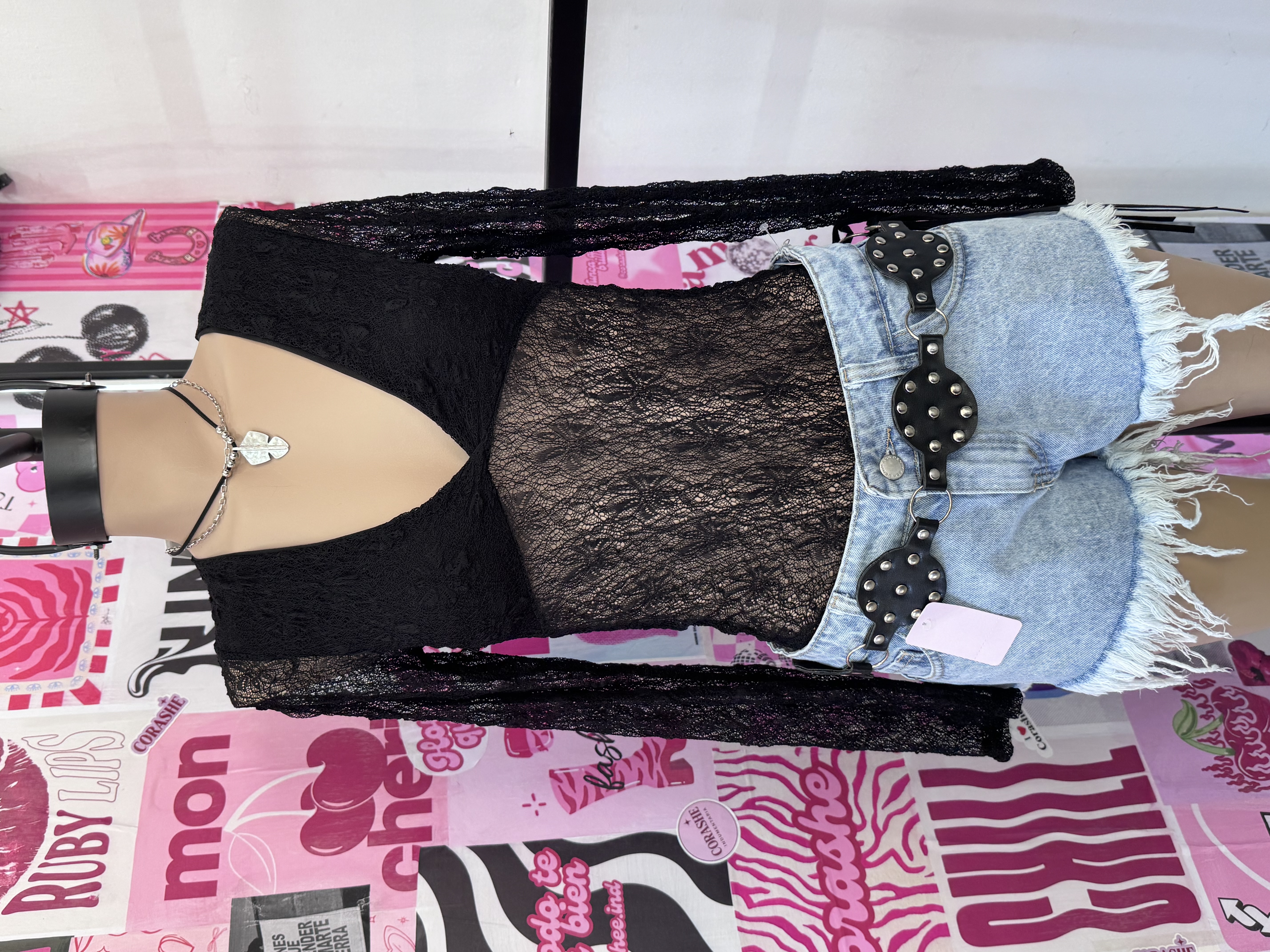 Body de encaje negro translúcido que mezcla sensualidad y elegancia en su versión más poderosa. Escote en V pronunciado que estiliza, mangas largas que equilibran y un efecto visual femenino que se roba todas las miradas.