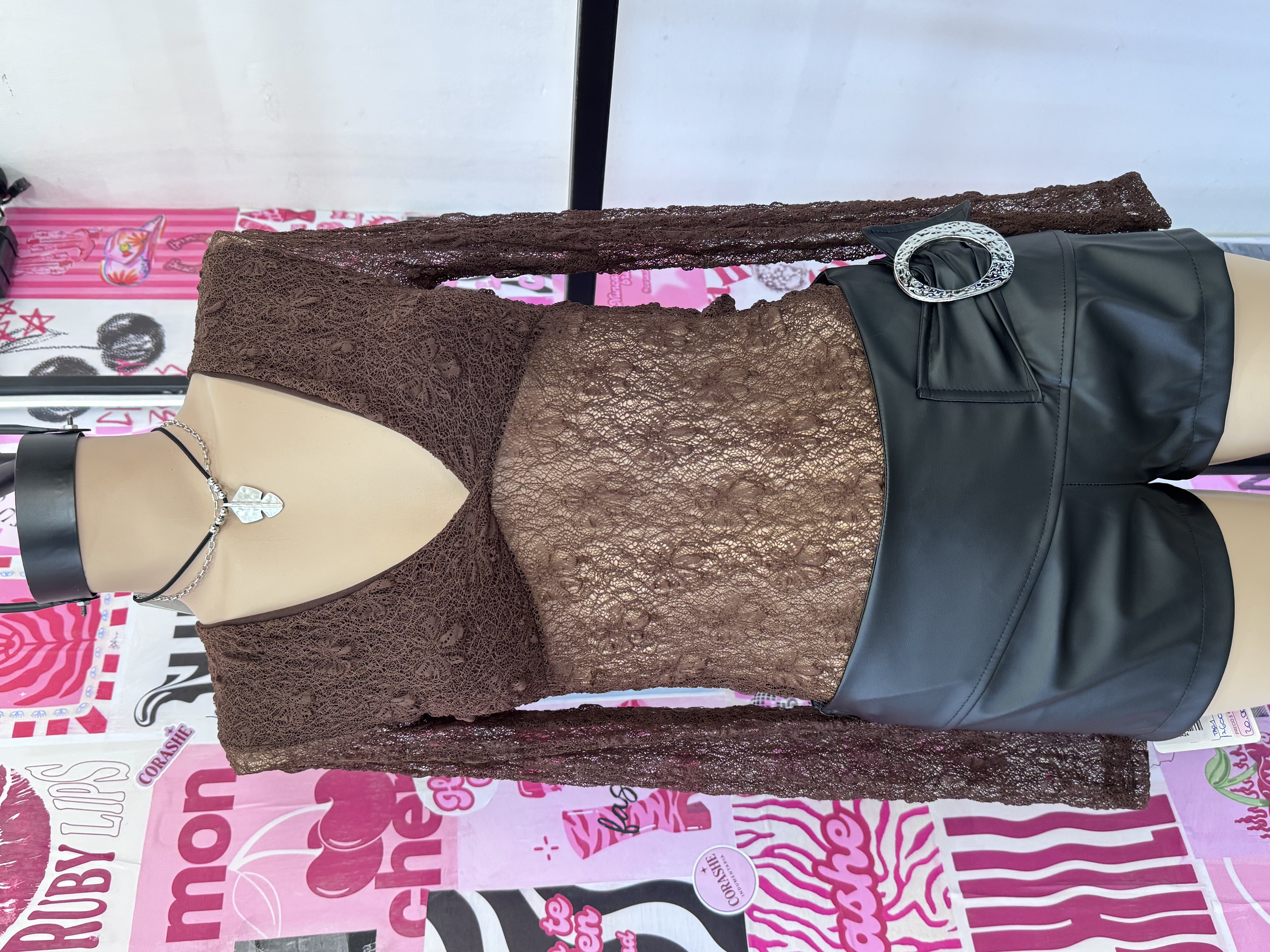 Body de encaje negro translúcido que mezcla sensualidad y elegancia en su versión más poderosa. Escote en V pronunciado que estiliza, mangas largas que equilibran y un efecto visual femenino que se roba todas las miradas.