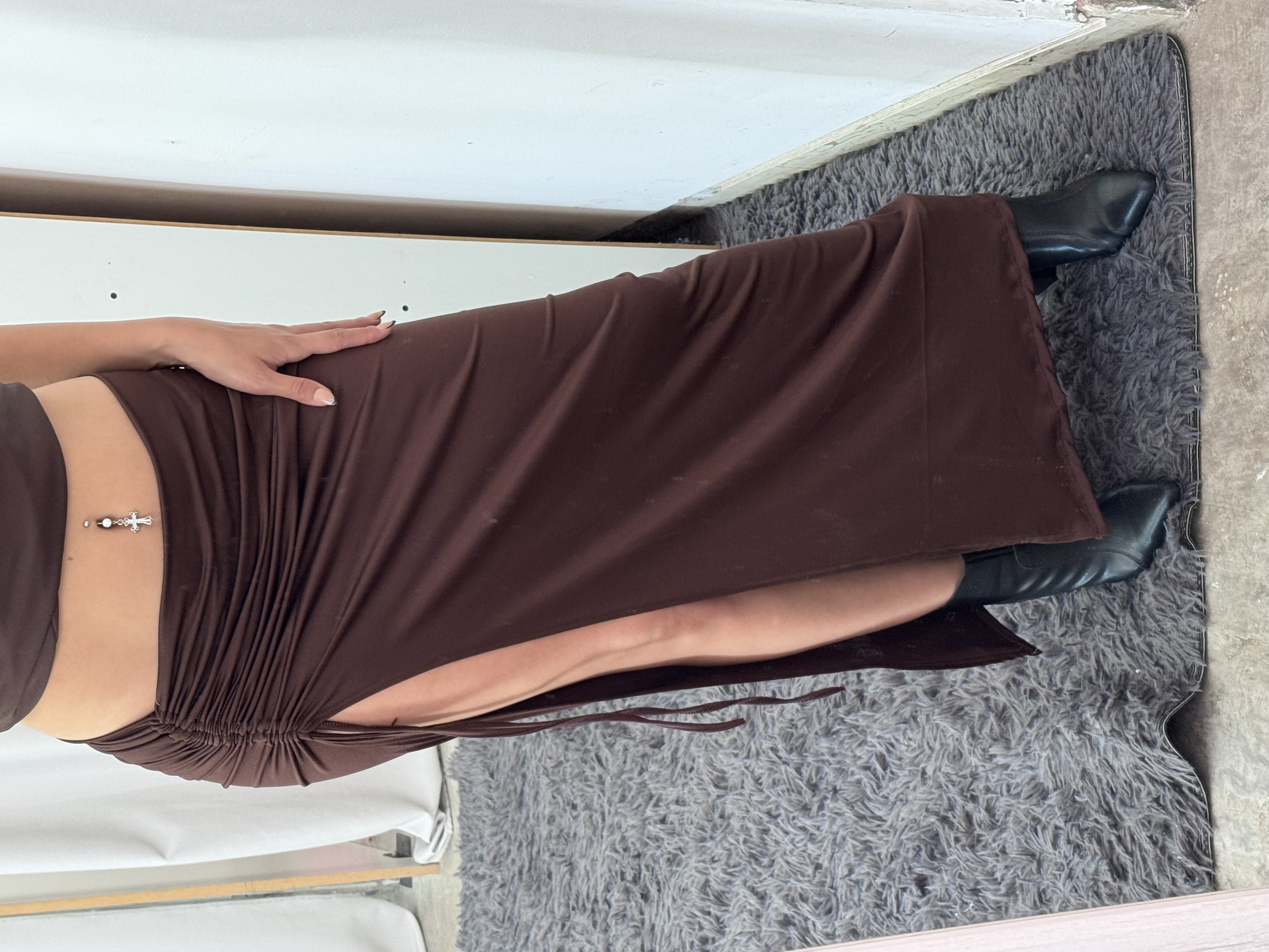 Falda larga efecto satinado con frunce lateral regulable y tajo profundo que estiliza y suma movimiento. Una prenda sensual, elegante y protagonista, perfecta para looks de noche con mucha actitud. ✨