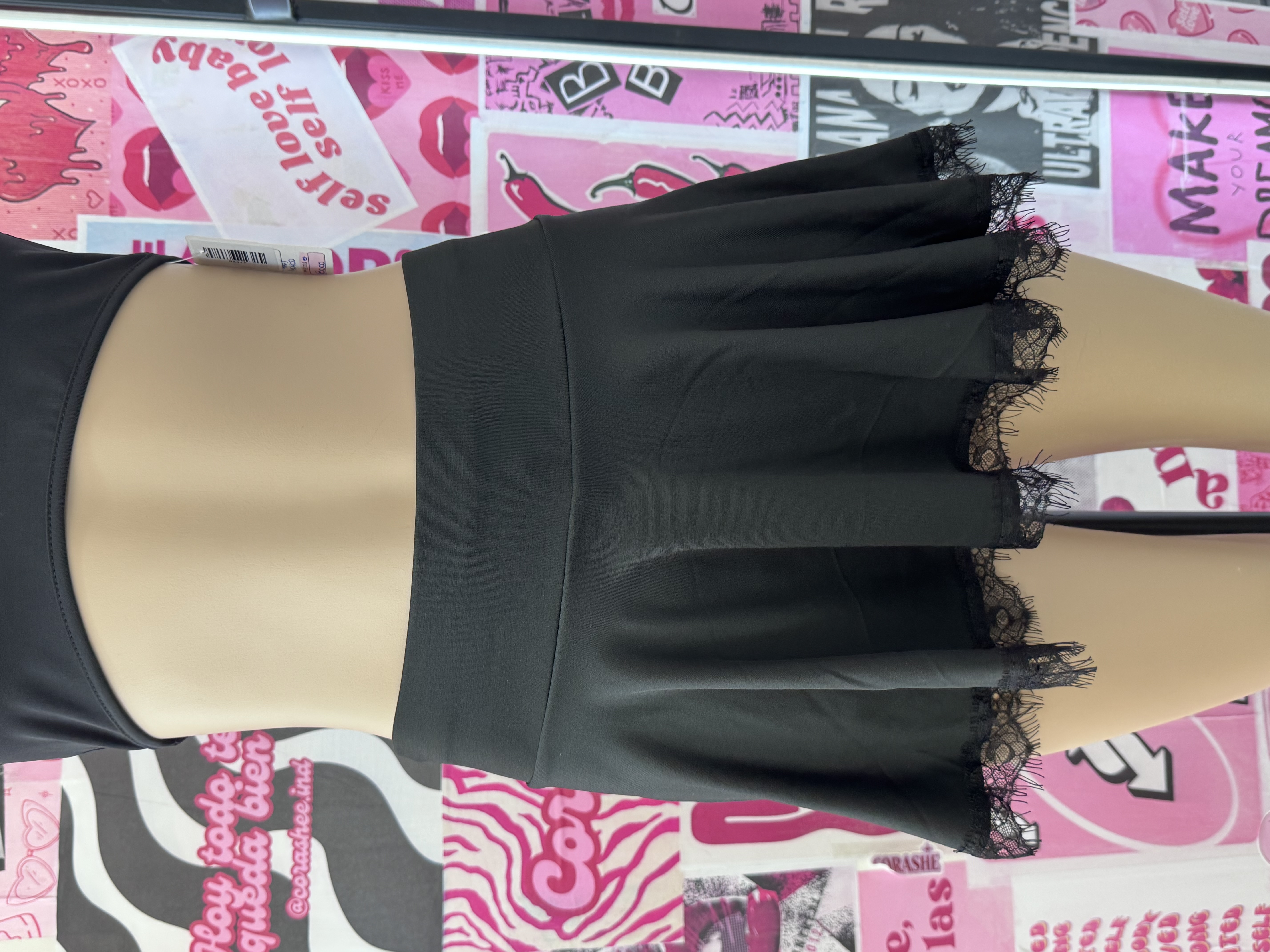 Mini negra con vuelo y detalle de puntilla en el ruedo 🖤